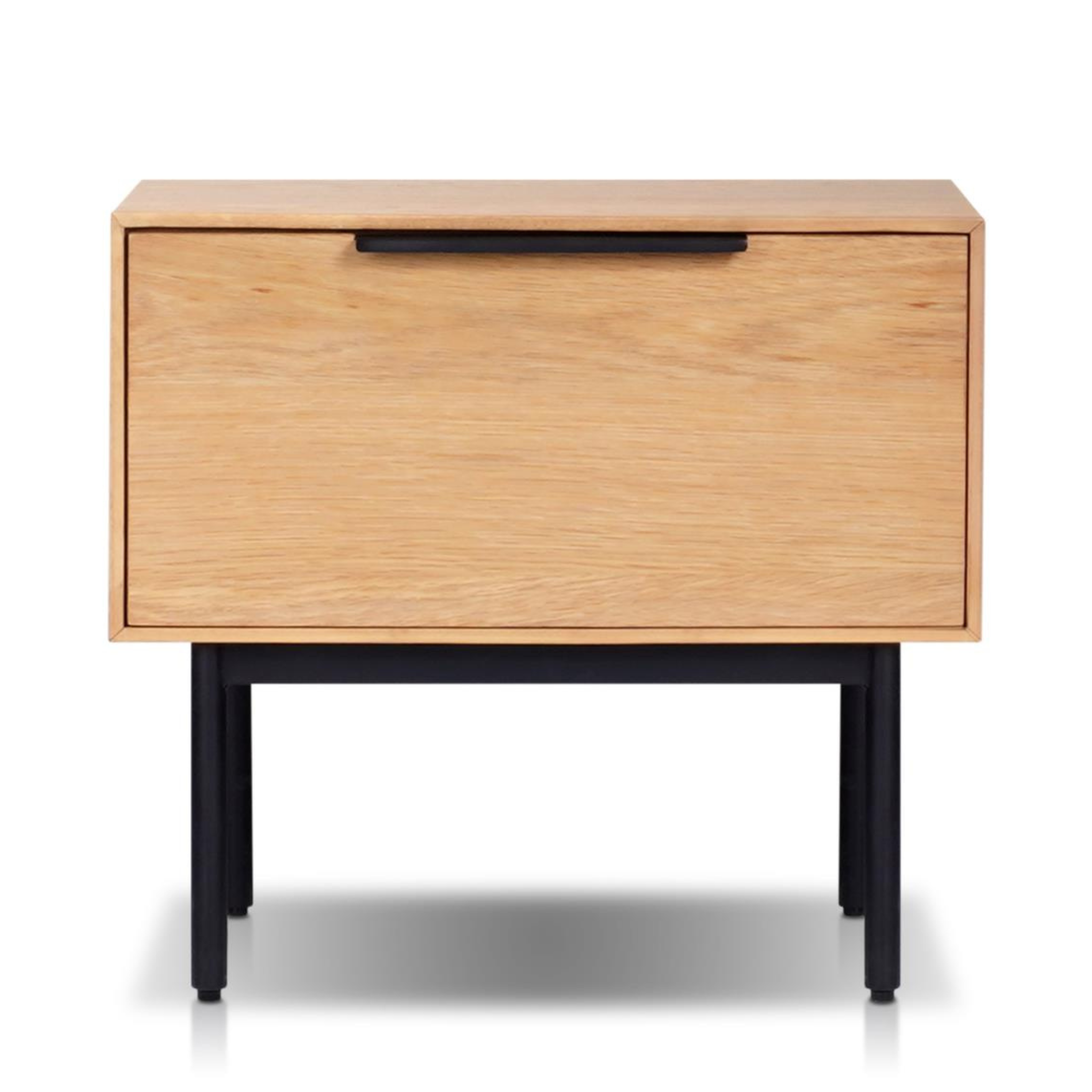 Introducing the Akira Mid Century Modern One Drawer Nightstand in Natural.  Minimalist design perfection.  Light natural wood tones blend perfectly with dark metal accents.
