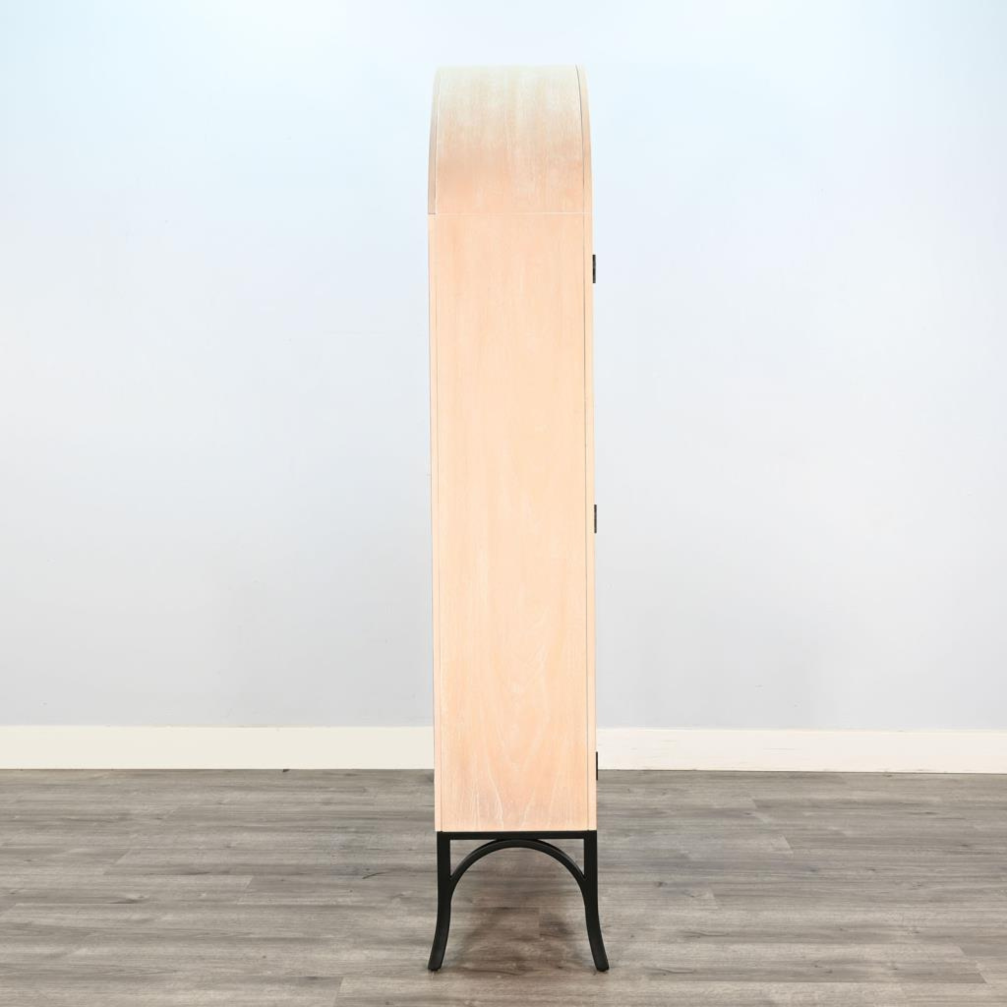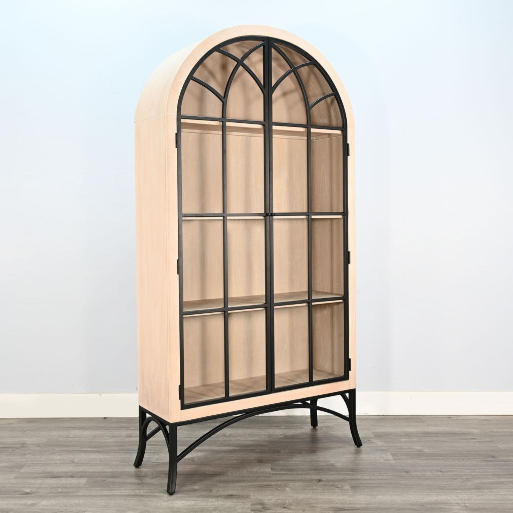 Introducing the Ella arched glass door cabinet in Natural with black metal accent.  Function and style merge perfectly with this beautiful statement piece.  Sturdy construction ample storage.