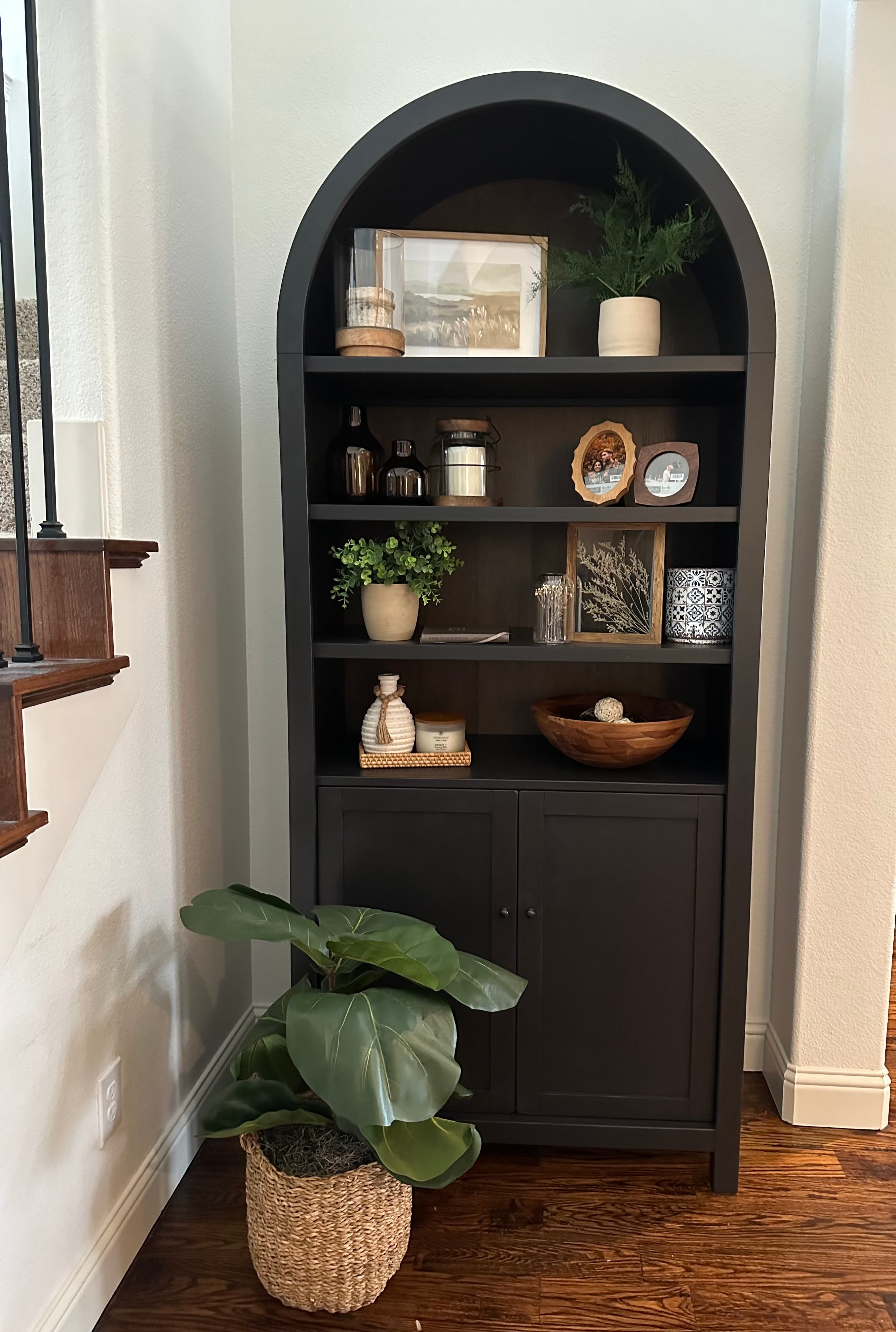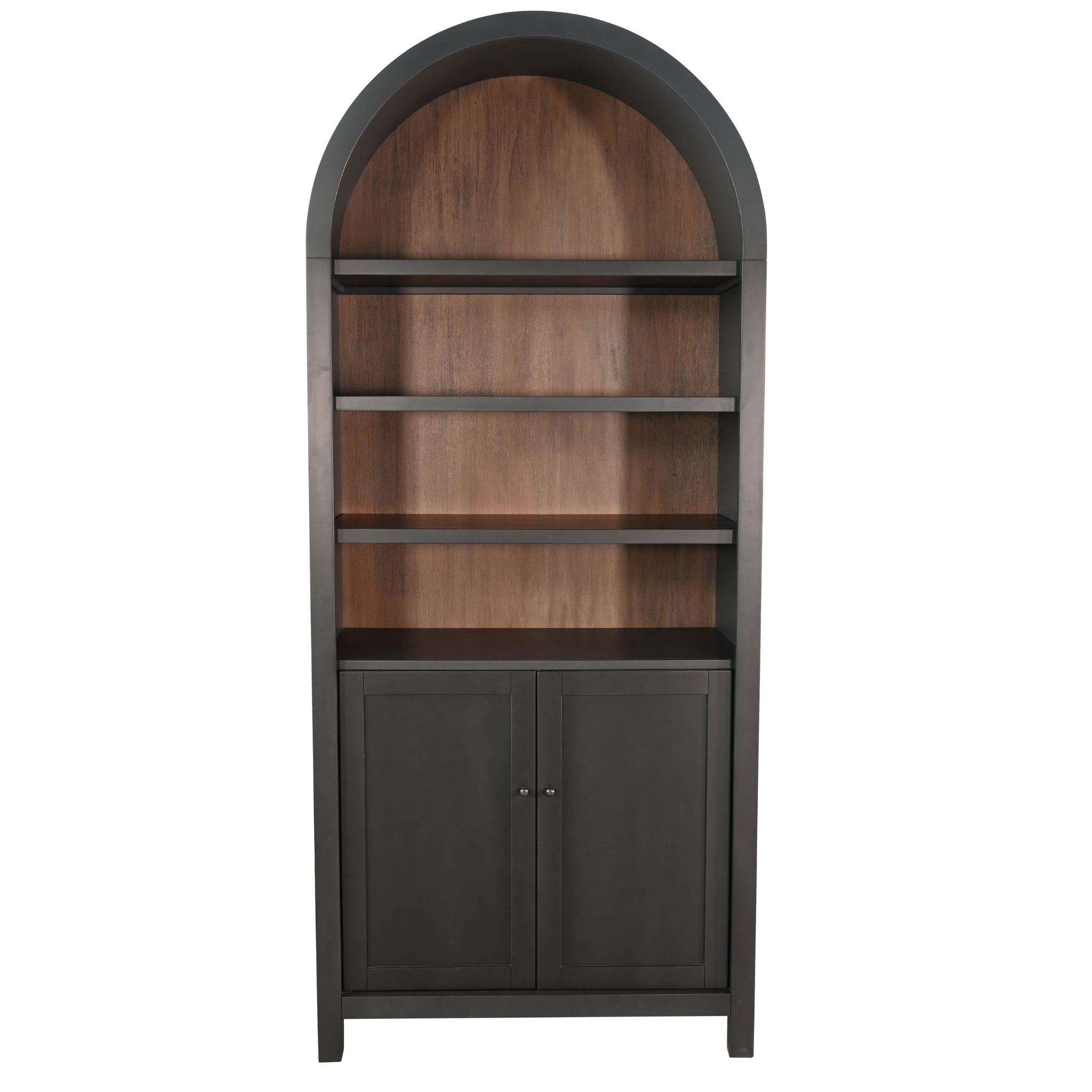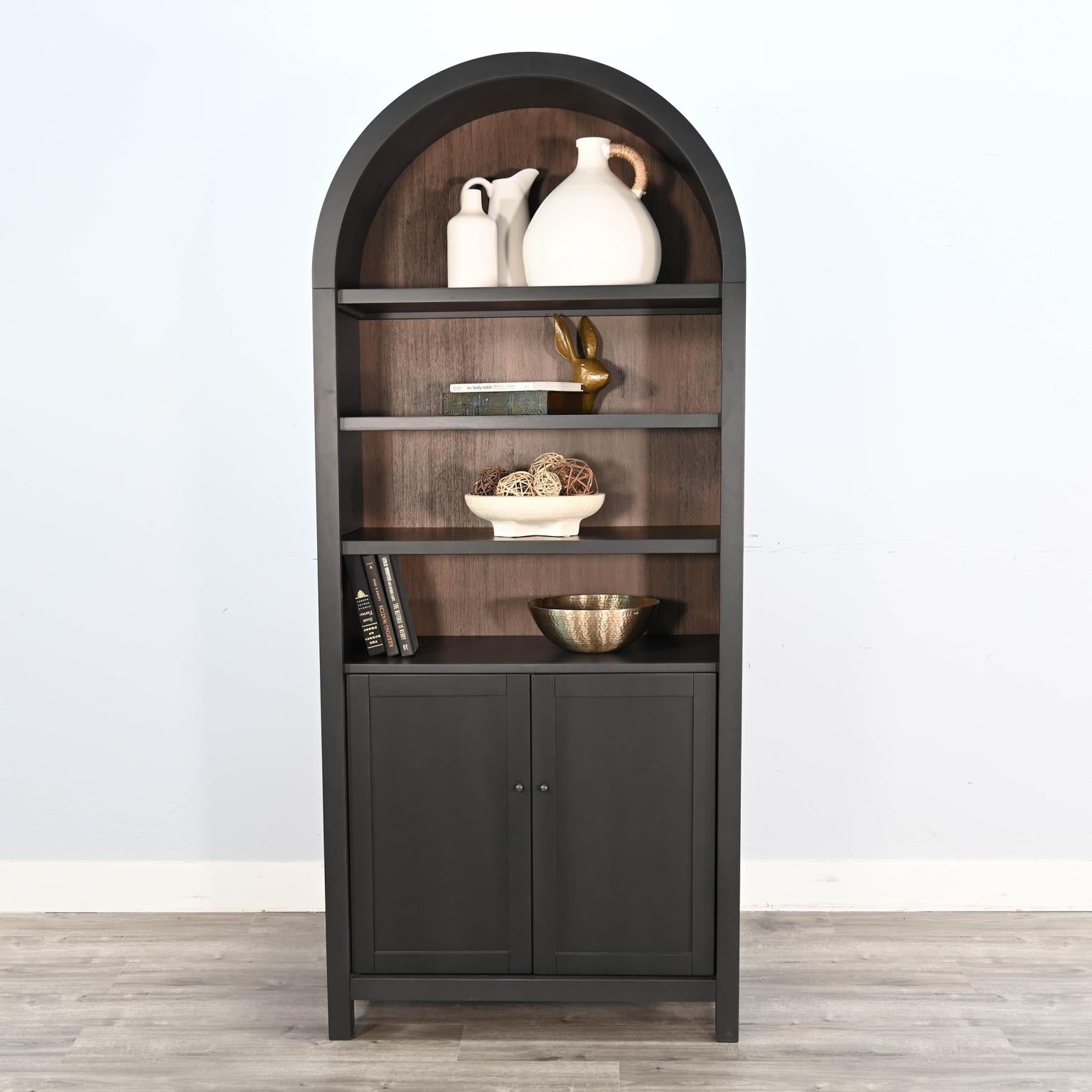 Explore modern design and functionality with this arched top cabinet with bottom doors in black. Featuring beautiful arched tops, and a complimenting back panel finished in Buckskin. The adjustable shelves provide options for showcasing all your décor. Mahogany solids and veneers are used to make this a timeless piece.
