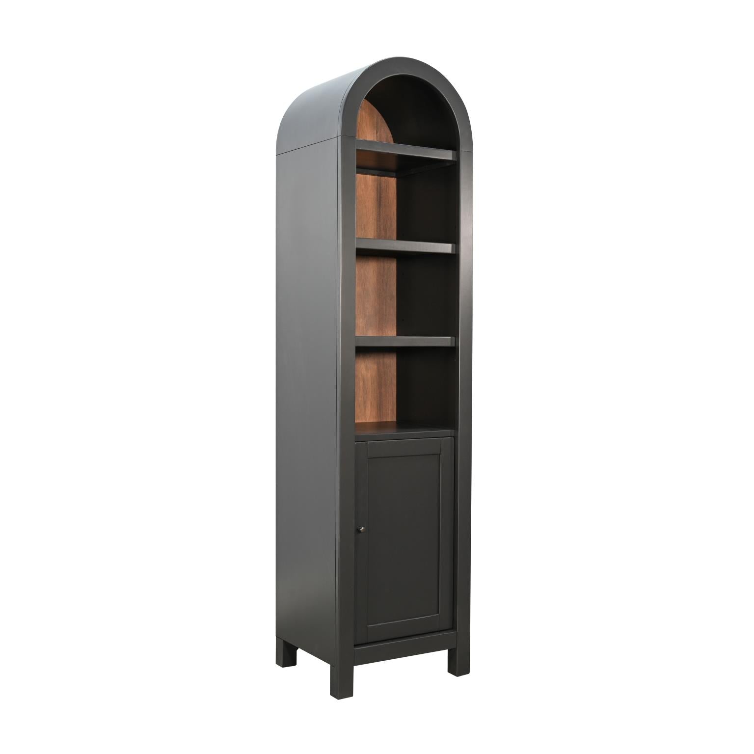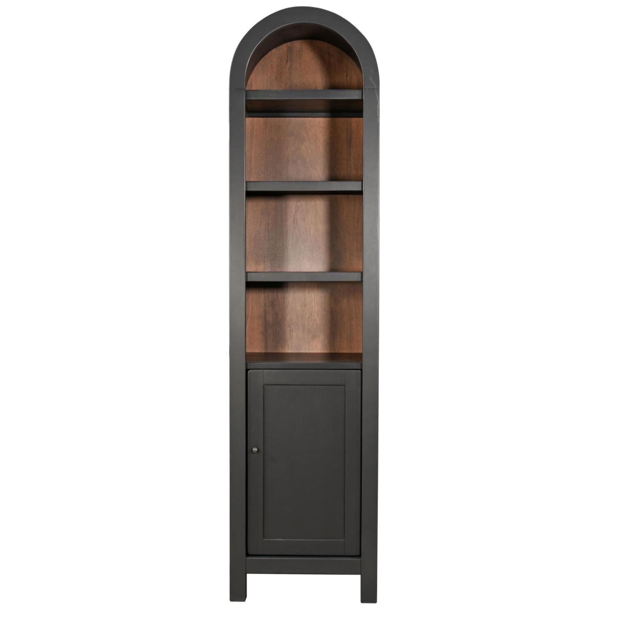 Explore modern design and functionality with this space saving arched top cabinet with bottom doors in black. Featuring beautiful arched tops, and a complimenting back panel finished in Buckskin. The adjustable shelves provide options for showcasing all your décor. Mahogany solids and veneers are used to make this a timeless piece.