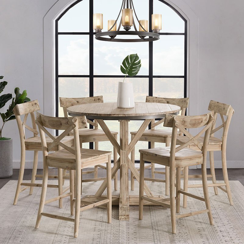 A rustic take on contemporary, the Callista offers a clean-lined silhouette and a weathered finish. The cross back chair adds to the inviting look with a farmhouse flair. The rectangular table sits on a trestle base and is crafted from solid pine and manufactured wood. This collection is perfect for a traditional, rustic, or cottage aesthetic.