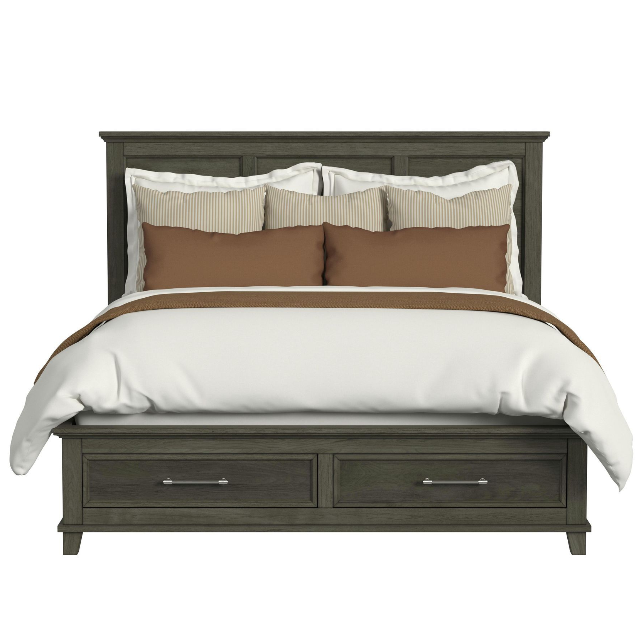 Introducing the Canterbury Storage Bed in Grey. A perfect blend of elegance and functionality designed to elevate your bedroom decor. This exquisite bed is crafted with cherry veneer and features beautifully beveled edges throughout, adding a touch of sophistication to any space. The footboard is equipped with smooth ball bearing drawer glides, while the rails feature Kenlin drawer glides for seamless operation. Available in both Queen and King sizes, this bed boasts brushed nickel handles, standard 10 slats, and six spacious storage drawers for ample organization. The inset panel fronts complete this refined and practical bed, making it a luxurious addition to your home.