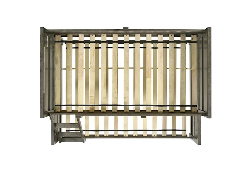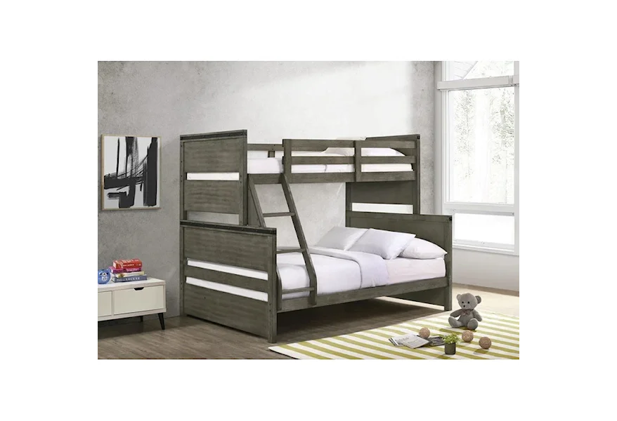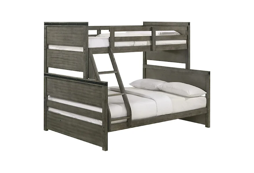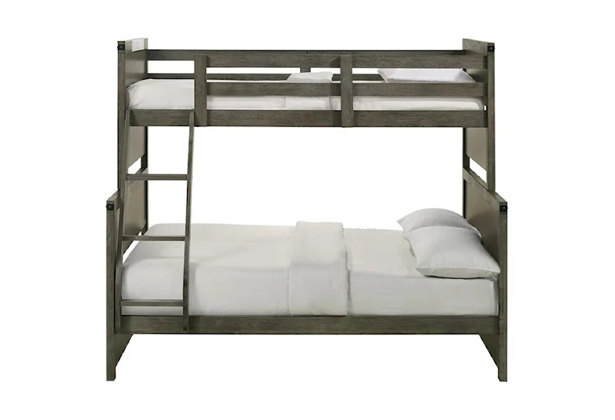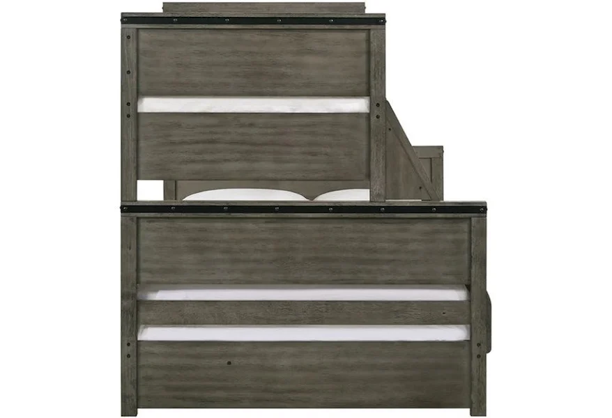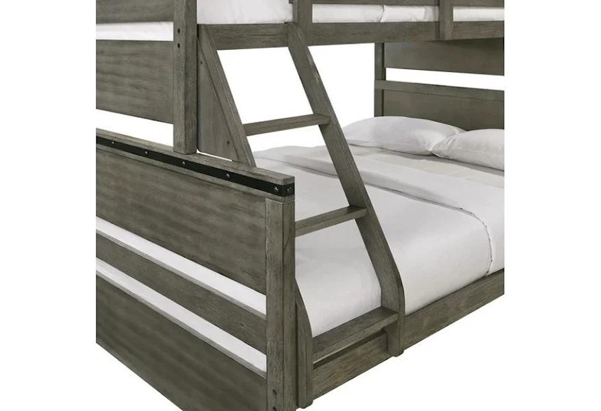 Introducing the Wade collection twin over full bunk bed. This bunk is the perfect addition to your kids bedroom! The tops of the headboard feature a metal trim in a black finish. Along the metal trim are decorative bolts, adding a little extra flair to this panel bed. This transitional style can easily pair with existing decor in your bedroom, or it's a great excuse to completely redo your bedroom. The cool gray finish is unique and will turn your kids bedroom into an oasis. Includes one side ladder and guardrails for safety.