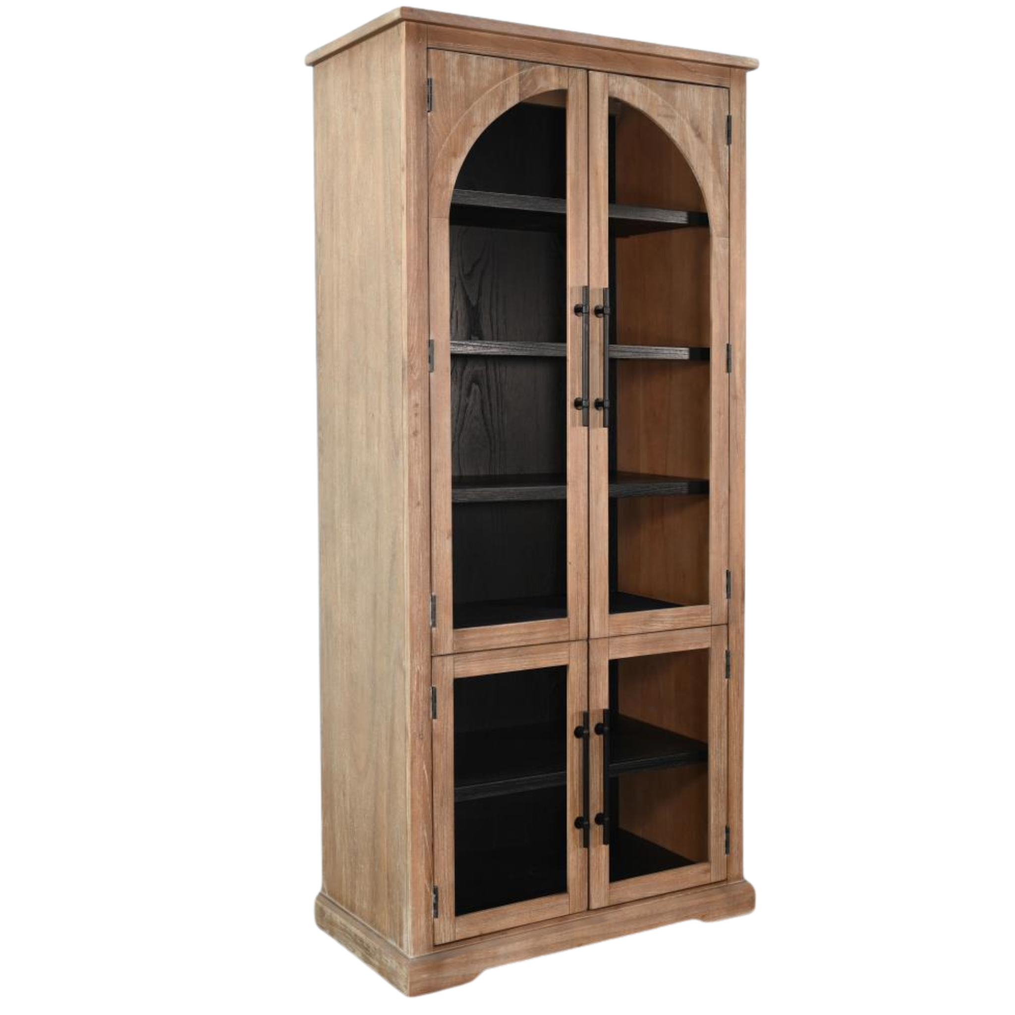 Introducing the Elena arched cabinet in natural and black. Featuring arched glass front doors, natural finish with black contrast interior shelving.