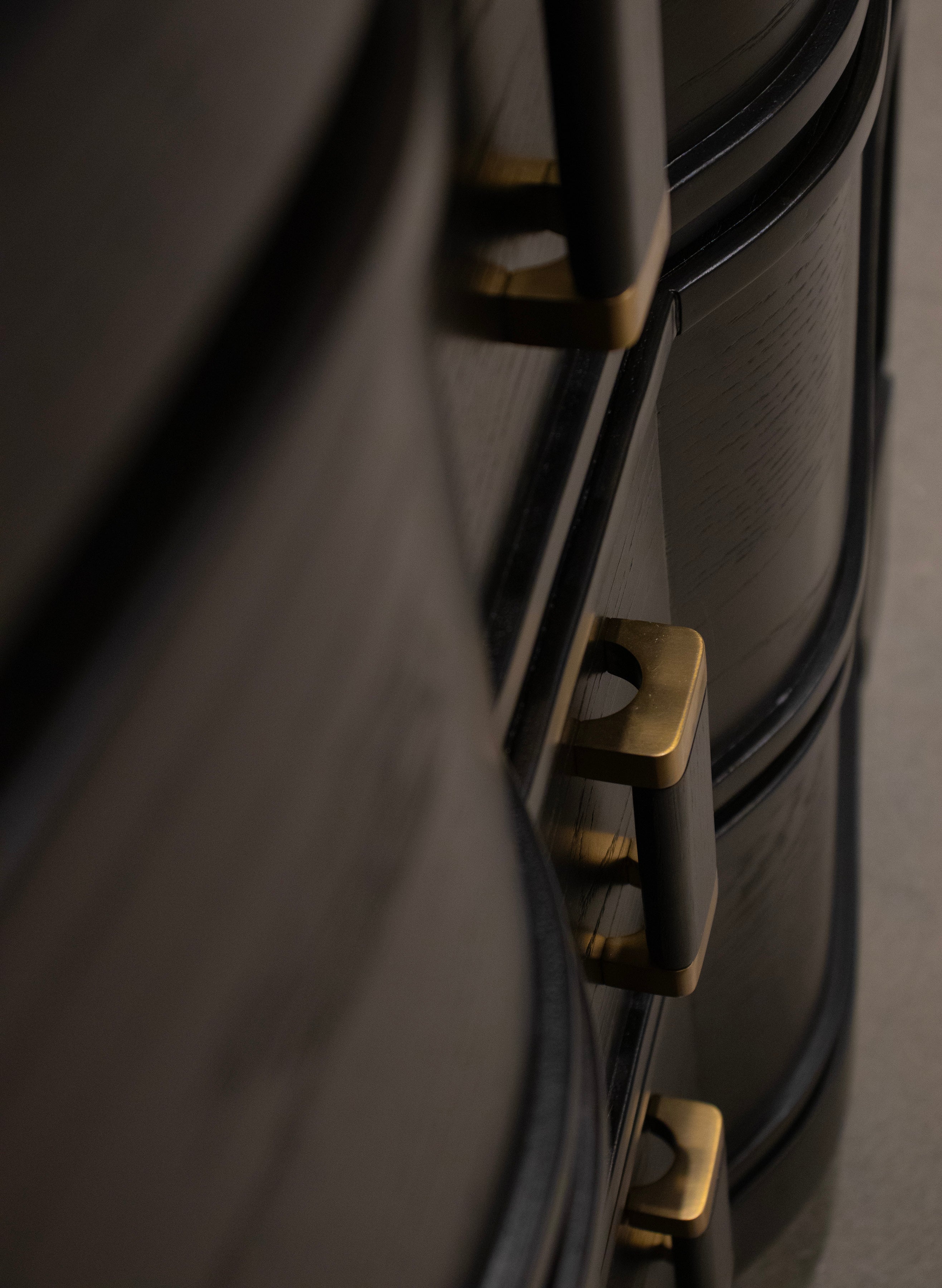 - Unique block feet that subtly curve back under the case