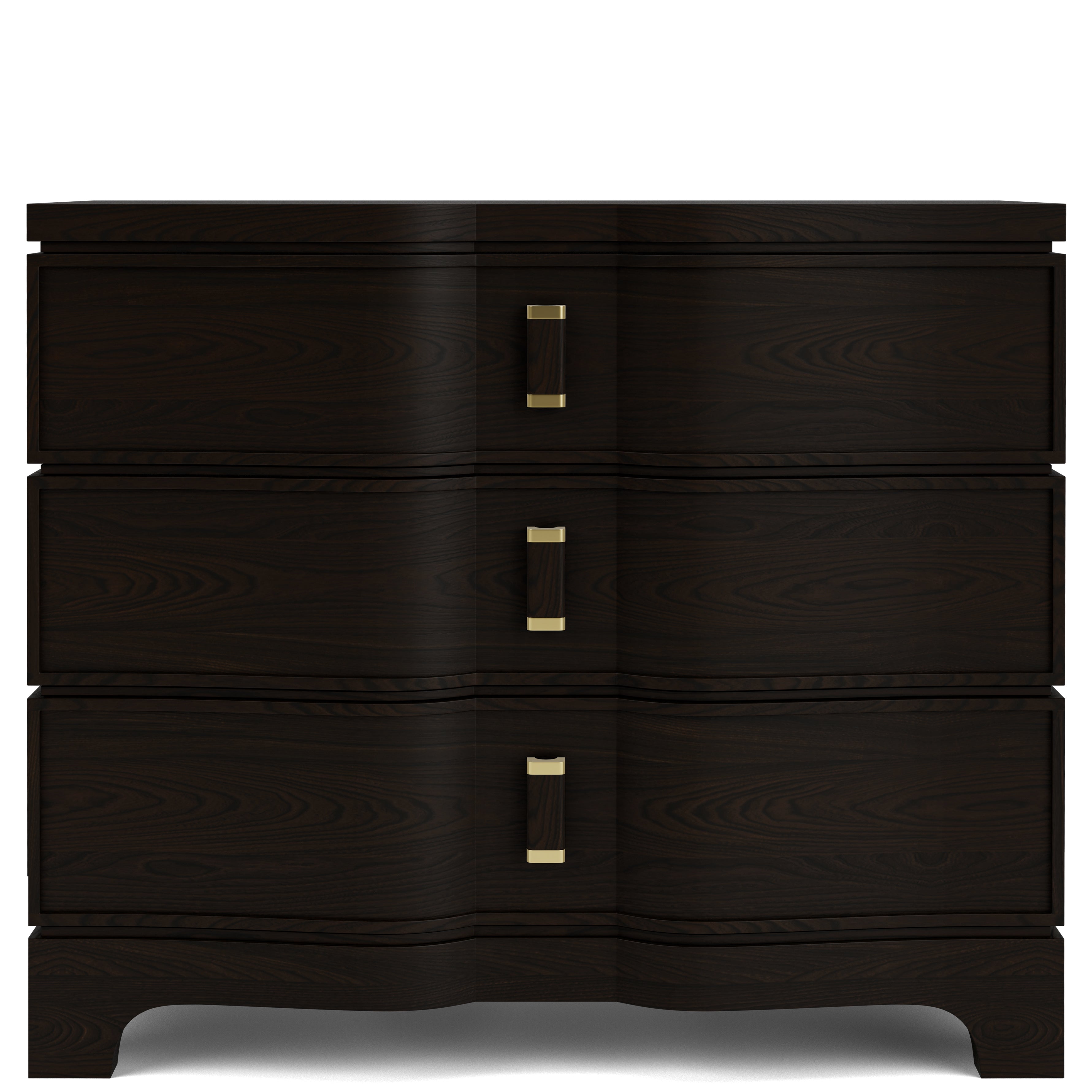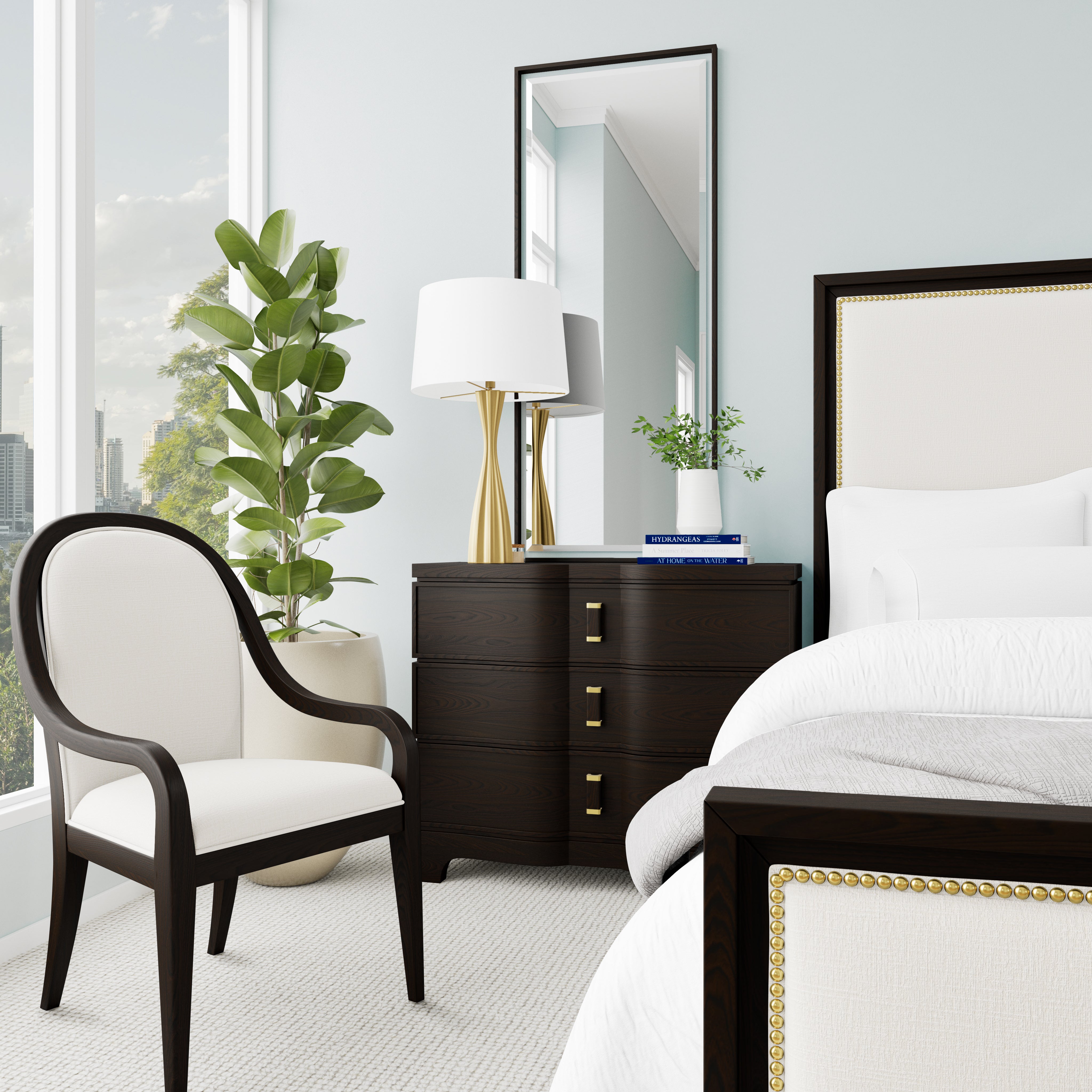 Lydia's sleek lines, complemented by rounded details, achieves a timeless modern contemporary style. The dark cabernet finish, combined with white fabrics, imparts a fresh and relaxed appearance. Linear hardware introduces visual interest, while maintaining an overall minimalistic aesthetic.