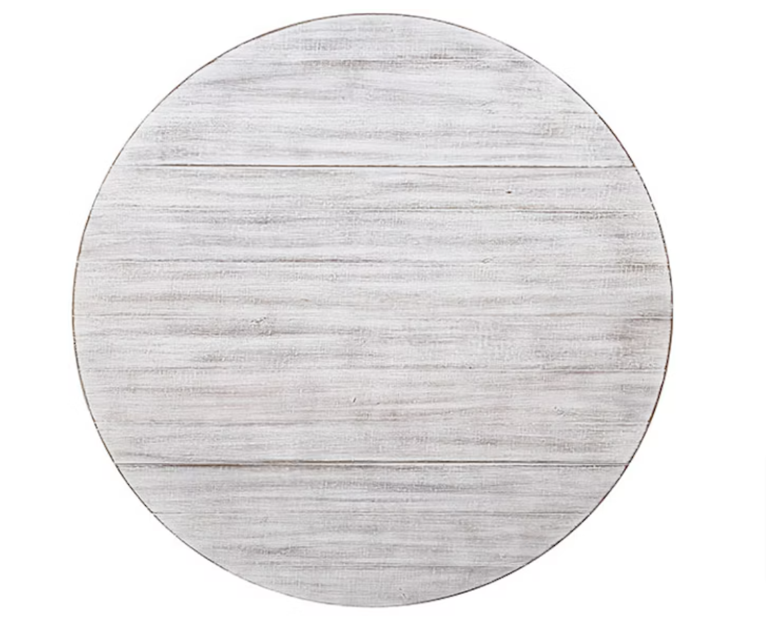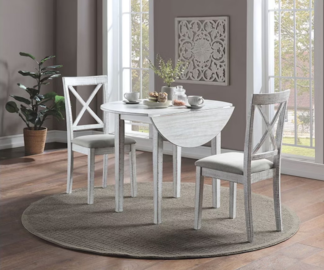 For small spaces, a convertible dining set with a drop-leaf offers not only practicality but also convenience. Take this lovely three-piece set for example. Each of the round table's edges drops down to accommodate a flush setting against a wall. Just like the table, the matching chairs are finished in antique white and feature light grey fabric seats and simple crossback designs for that barnyard vibes.