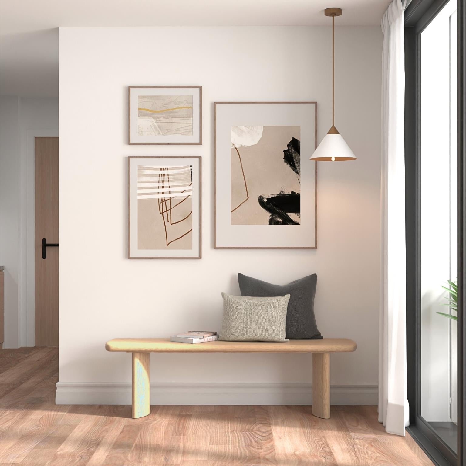 Introducing the Gabrielle 64" dining bench in light oak finish. Featuring rounded edge top and curved double pedestal legs.