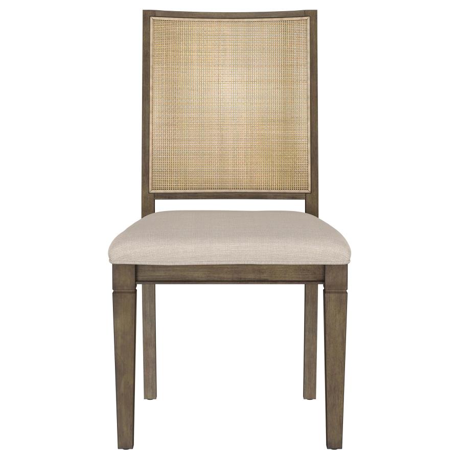 A trio of natural hues brings refined but casual character to a modern farmhouse dining chair. Perfect for friends and family enjoying delicious meals, the chair features a plush foam seat with beige upholstery. Its back is rattan, adding texture and character while maintaining a light, airy look and feel that's rich and breathable. Its classic stance features an armless silhouette complete with a gently angled back and straight, tapering legs. The natural finish of the wood offers a refined but accessible look, perfect for inviting family spaces.