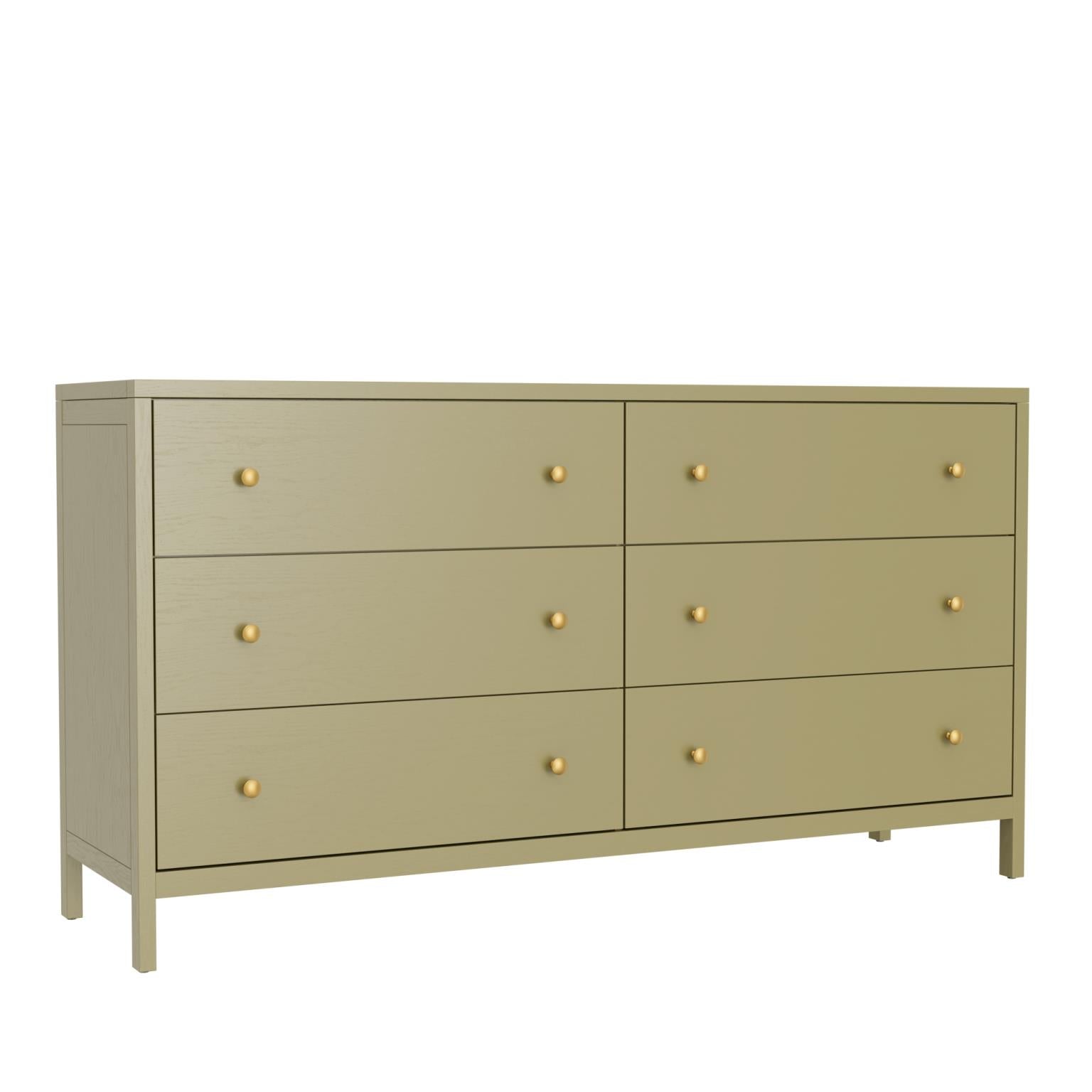 Bring contemporary charm to your bedroom ensemble while keeping clutter to a minimum with this stylish Avery olive green dresser.  This 6 Drawer Dresser showcases clean lines and a beautiful olive green finish to give your room a pop of color.  Features include top felt-lined drawers and brass drawer handles.