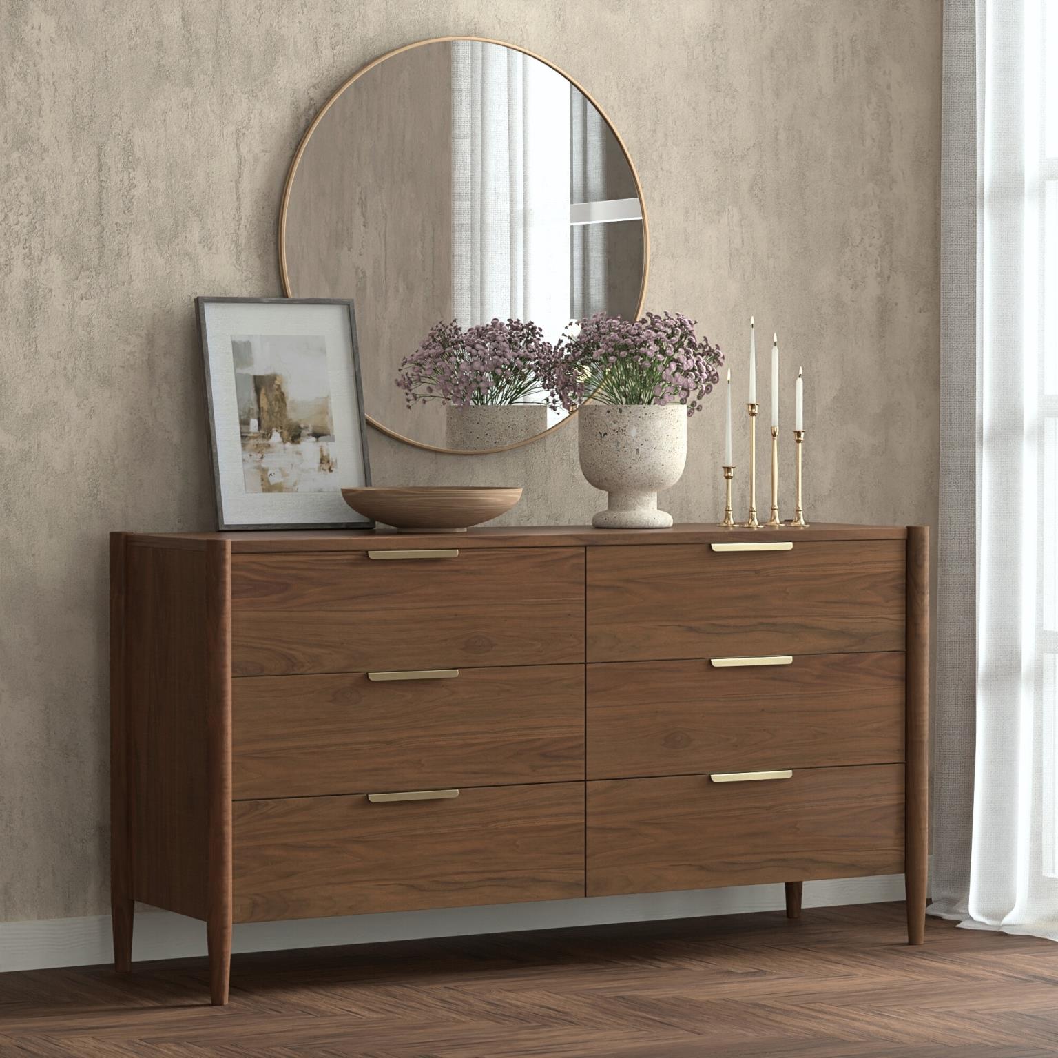 Bring timeless sophistication to your space with the Sinclair Dresser. Fully assembled for your convenience, this dresser features a Coastal Natural Finish or Rich Walnut Finish with striking gold handles. Its six soft-close drawers are built with English dovetail construction and metal ball bearing glides, offering durability and effortless functionality. Ideal for maximizing storage without compromising style, this dresser is the epitome of modern coastal design.