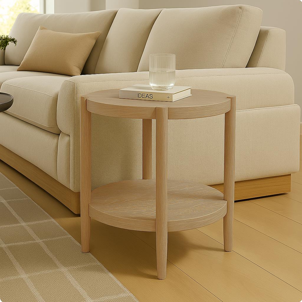 The Sinclair Round End Table brings effortless sophistication to your space with its soft curves and clean silhouette. Made from solid rubberwood and oak veneer, this compact yet functional table features a round top and open lower shelf—perfect for displaying décor or keeping essentials within reach. Available in both Natural and Walnut finishes, it’s a stylish complement to any living room or bedside setup. Simple assembly required.