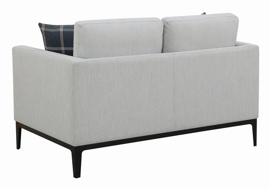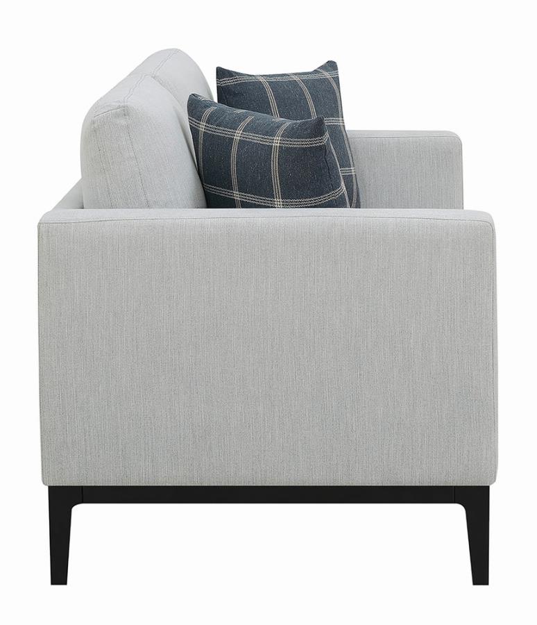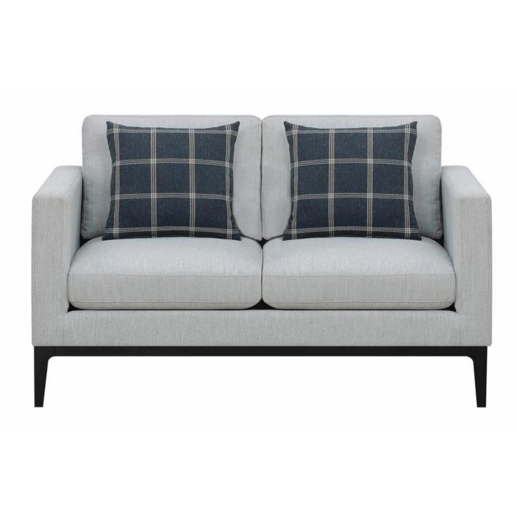 This loveseat is the ultimate in casual comfort. With a soft, plush back and seat cushions, it offers hours of soothing relaxation. Its lovely, muted shade of light grey blends effortlessly with a variety of color palettes. Two dark accent pillows with a pleasing plaid pattern provide a lovely contrast to its frame. This loveseat is a beautiful enhancement to any living room's decor.