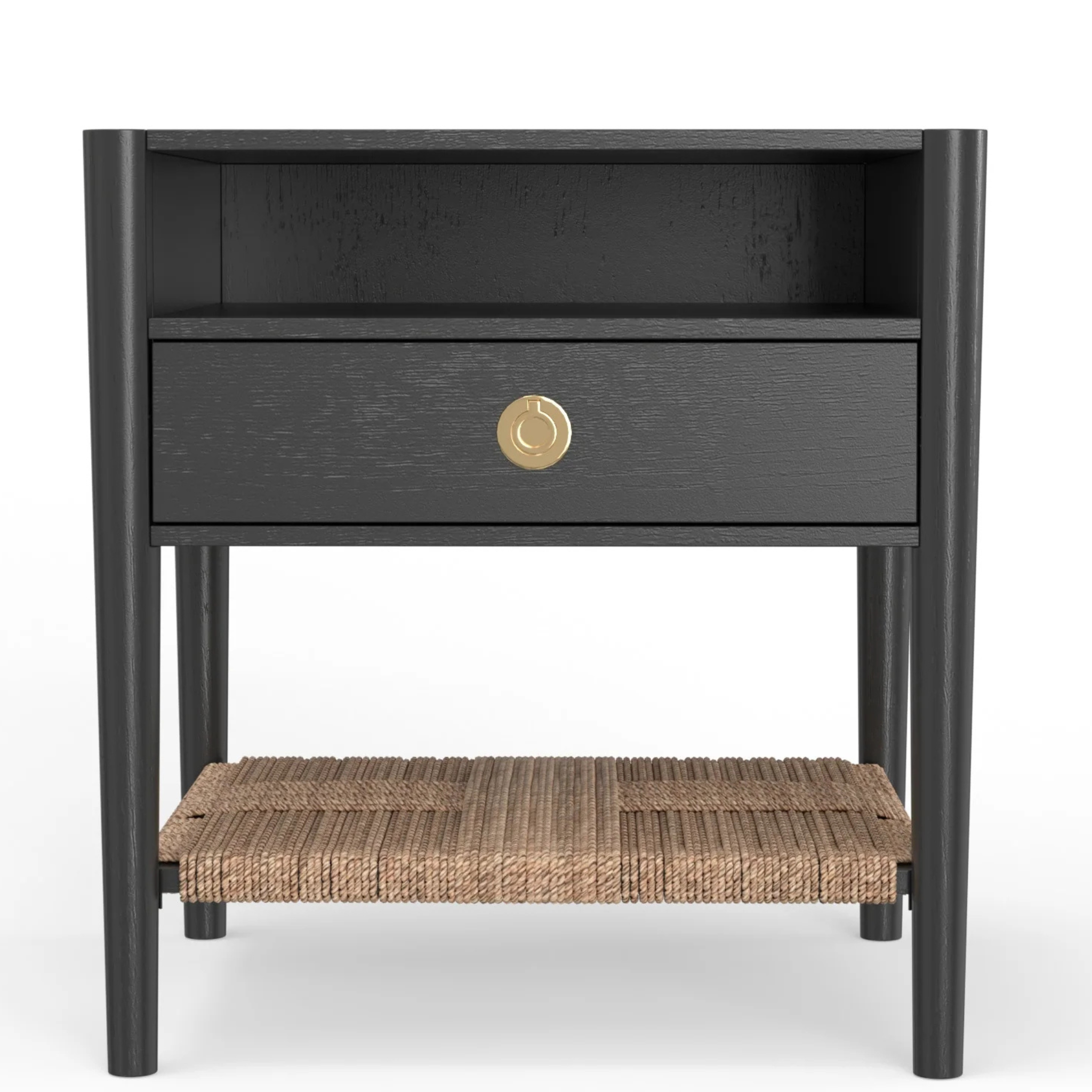 Introducing the Cleo nightstand. All the functionality and style you could want from a nightstand. Open cubby, One Drawer, & Bottom shelf. All done in a beautiful charcoal gray (almost black) finish with rattan shelf & brass pull knob. Compliment your bedroom perfectly with this unique piece!
