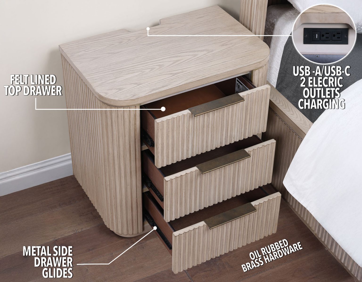 - The Nightstand boasts elegant styling with reeded detailing, gently shaped corners, built in USB charging, and a sturdy plinth base for added stability.