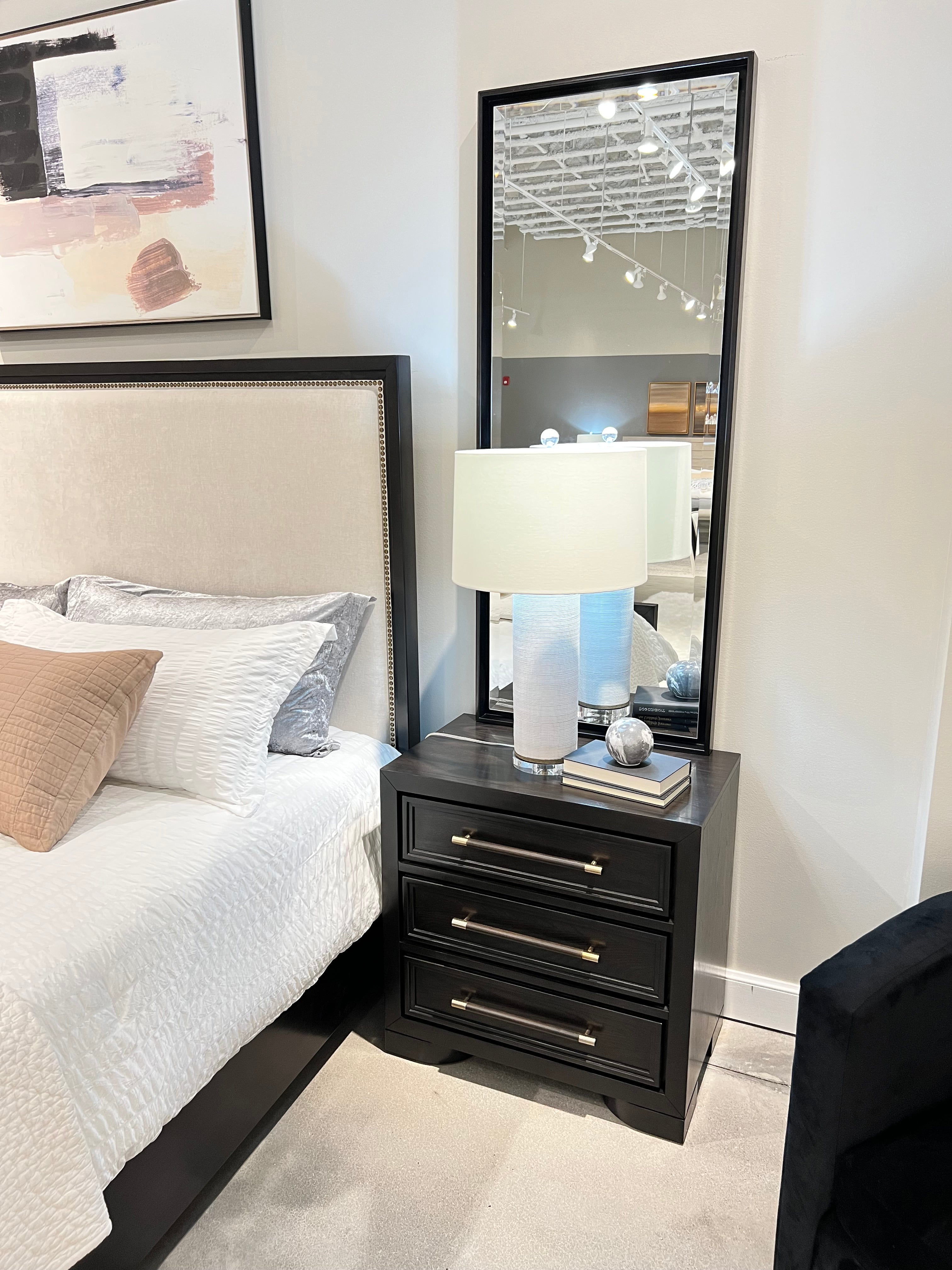 Lydia's sleek lines, complemented by rounded details, achieves a timeless modern contemporary style. The dark cabernet finish, combined with white fabrics, imparts a fresh and relaxed appearance. Linear hardware introduces visual interest, while maintaining an overall minimalistic aesthetic.