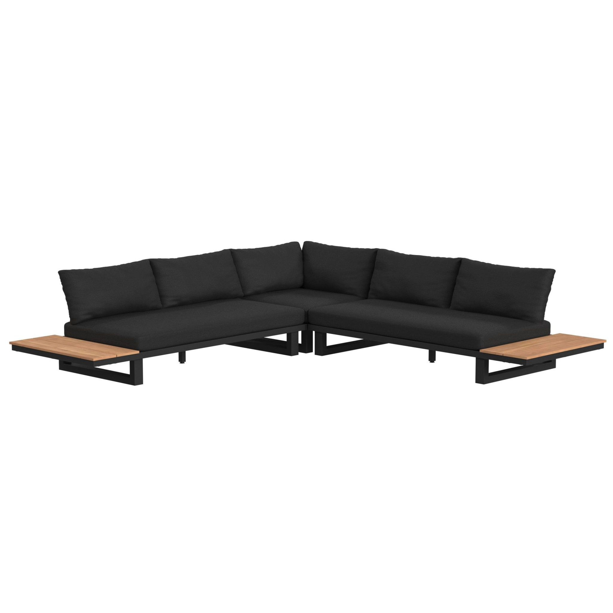 Outfit your patio with the sleek and practical style of the Cabana Three-Piece Outdoor Living Set in Black. Designed to sustain the elements, the high-quality aluminum framing and weather-resistant olefin upholstery are optimal for outdoor use. A bold skid base creates a unique silhouette and bolsters visual appeal, while the two slatted wood side tables are thoughtfully fashioned to prevent the pooling of water. Functional and refined, the Cabana Three-Piece Outdoor Living Set in Black is poised to define your patio space with its adaptable style and quality construction.