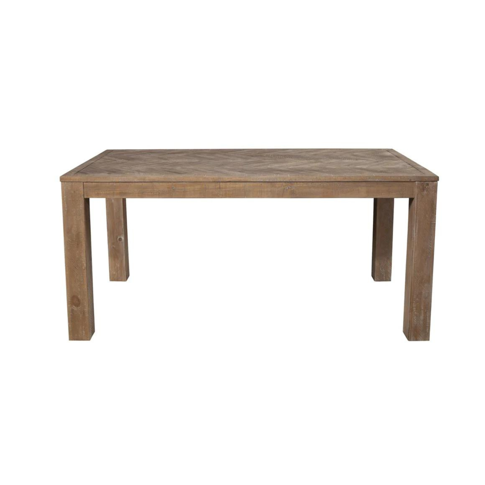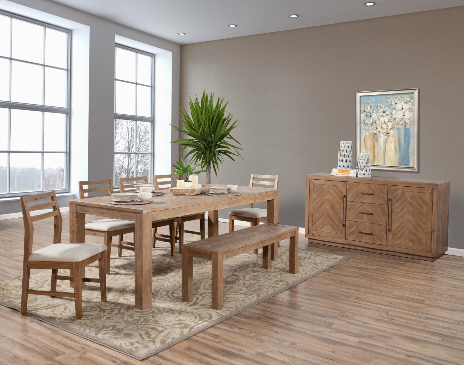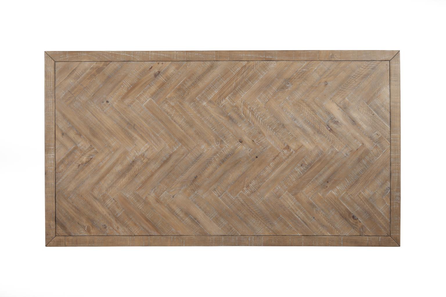 The Aiden collection creates an enticing atmosphere in your dining room that reflects a fashionable take on a rustic style. Rendered in a Natural Weathered (Brown) finish on Pine solids, this dining set embodies traditional character with a cool and casual attitude. The tabletop feature an inlaid chevron pattern. Coordinates with other pieces from the Alpine Furniture Aiden dining group.