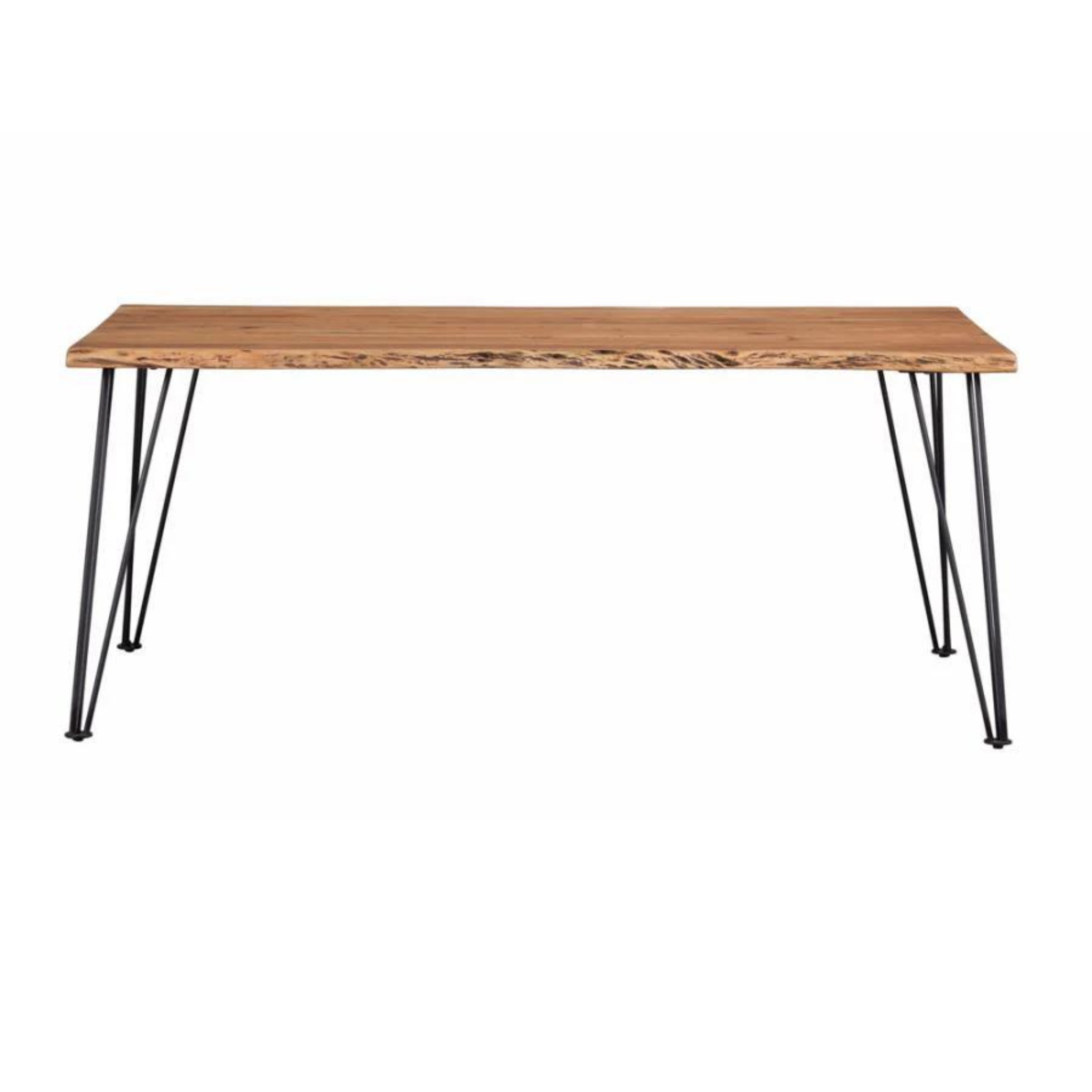 - Gorgeous solid acacia wood table with a natural live-edge table top and iron metal hair pin legs.