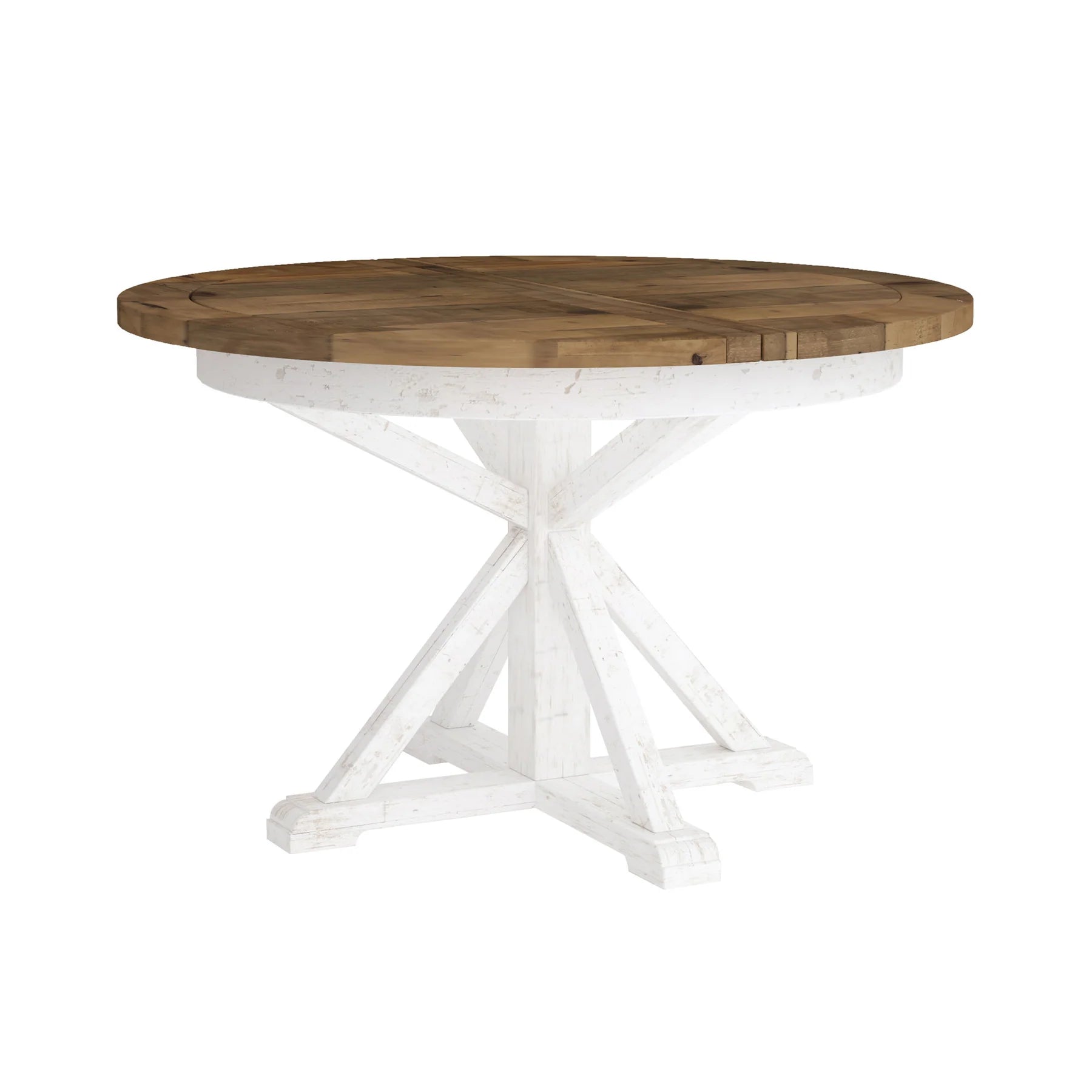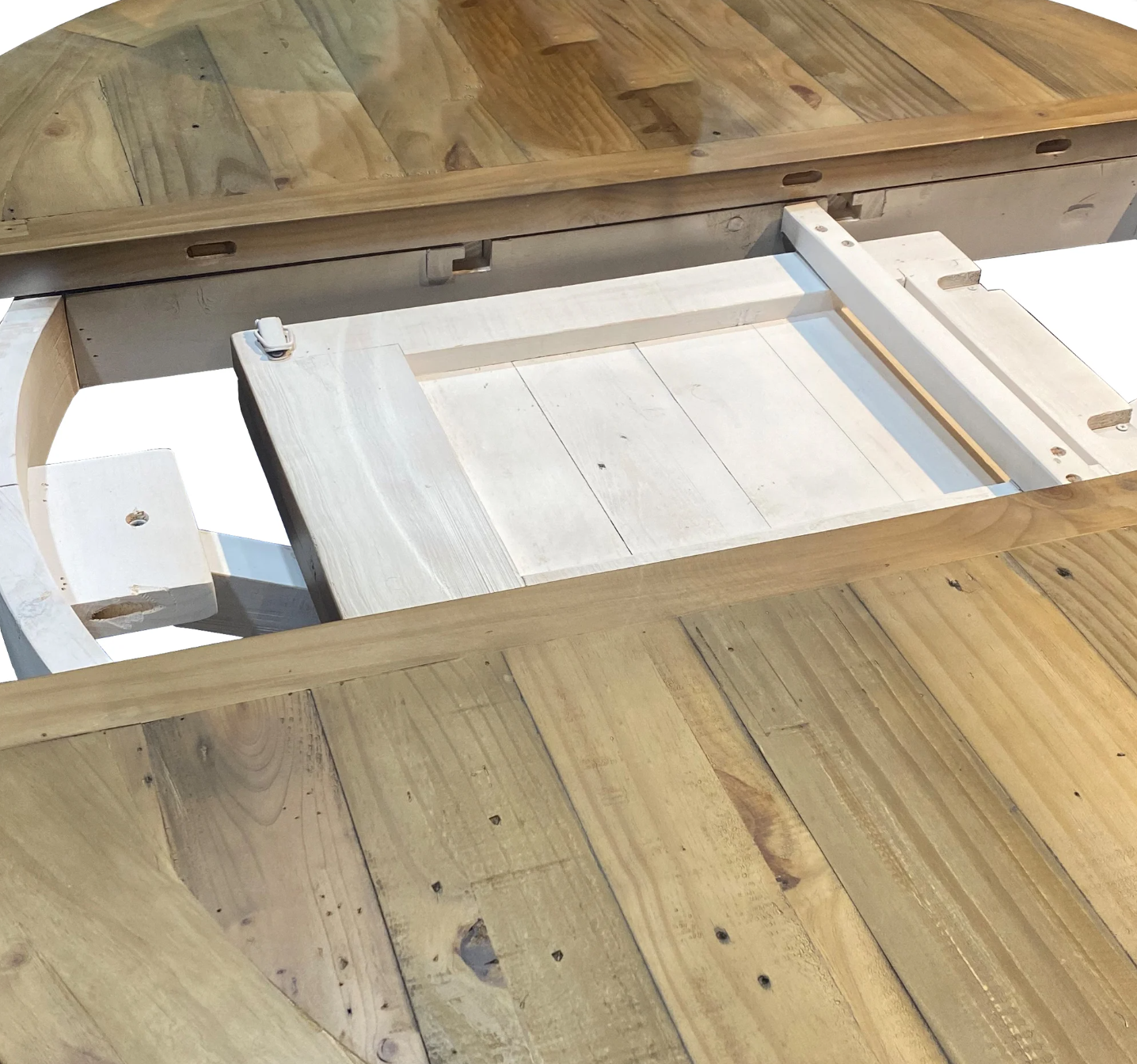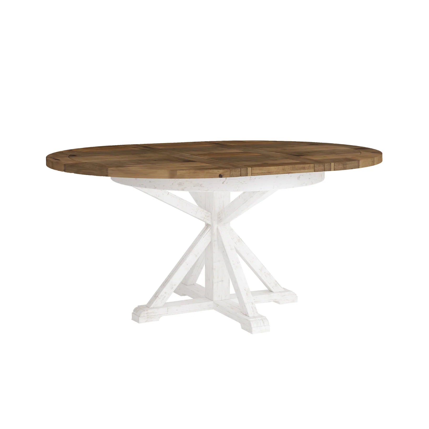 The Provence round extension dining table embodies natural rustic charm with an antique white finish.