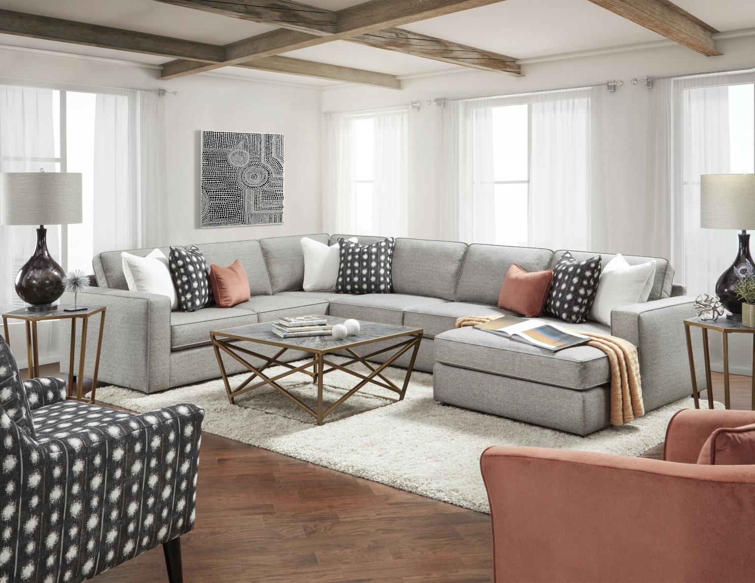 Perpetual gunmetal grays set an ethereal tone for our Monroe Ash Collection. This massive group has ample seating for every member of the family. With bright white setting the eyes focal point and the water-soaked earth color of clay combining to form a splendidly serene composition; the accent pillows become the star. The welted cords delineate the line of the track arms and cushions, while accent pieces give the space added dimension. Star gazing!