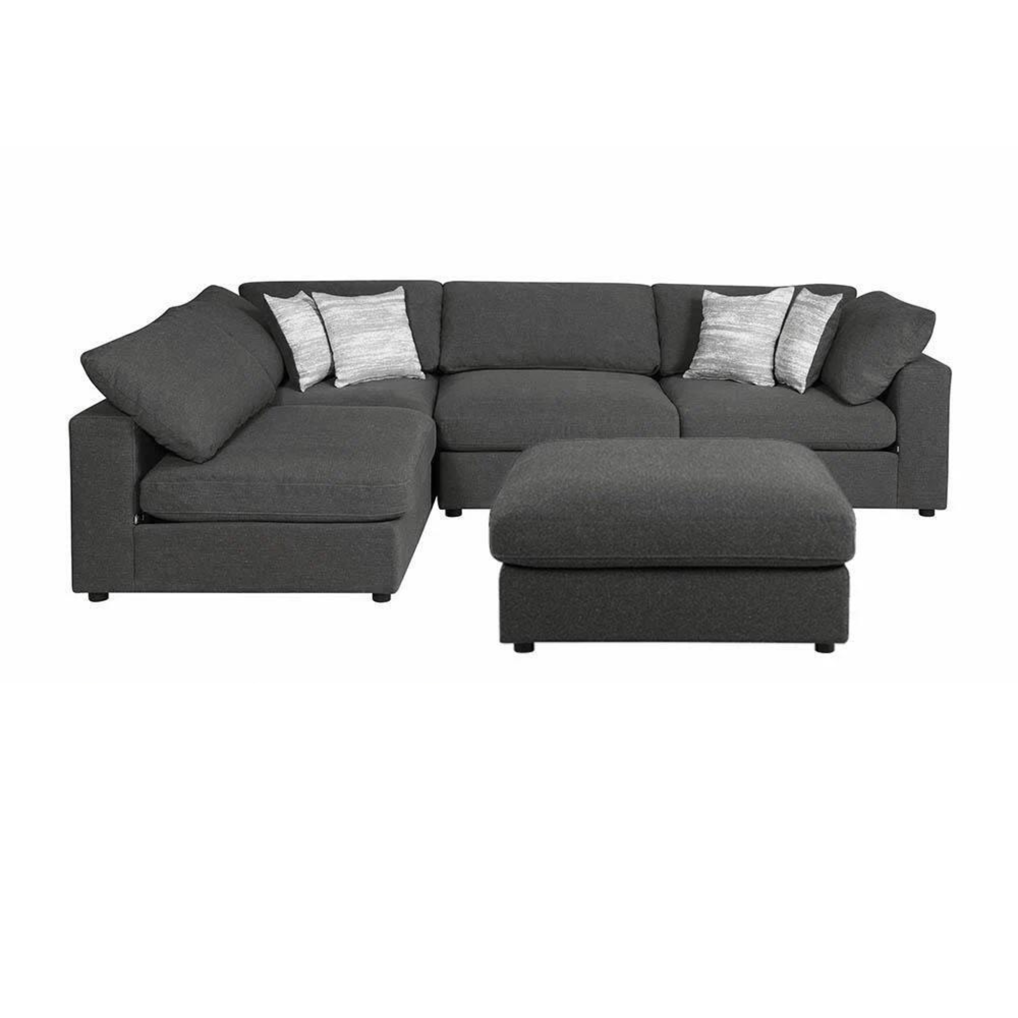 Limitless possibilities with this 5 piece modular feather blend sectional. Extra deep cushions invite relaxation with modern transitional design. Configuration shown consists of 2 corner chairs, 2 armless chairs, and 1 ottoman.