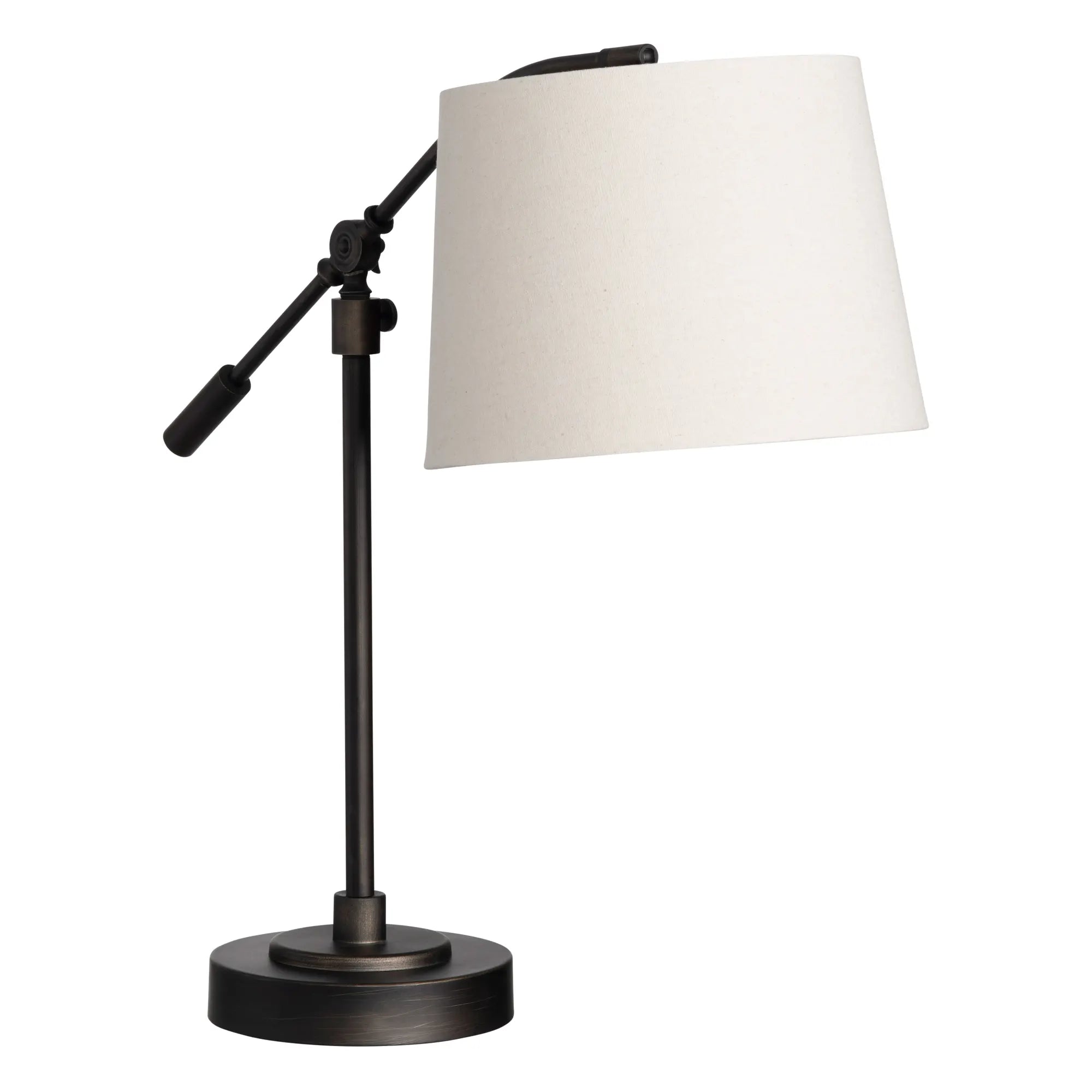 The Crestview Collection Healy Articulating Task Lamp is the perfect study buddy on your desk. This traditional task lamp has an aged bronze finish complemented by the natural linen shade. The downlight, tapered shade sits at the end of an arm, which you can move to position the light where it is most needed. Adjust the height of this lamp to customize it even more.